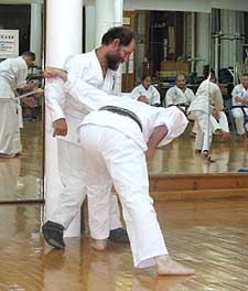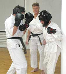 Kevin participating in free fighting, with the author, Sei Shihan Christopher Caile supervising (background). Over the course of an hour Kevin fought four or five opponents. While he is able to punch and block, Kevin has very limited kicking ability due to his physical limitations.