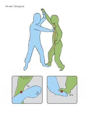 Illustration 2; Blue counters a strike with a step-in rising block that strikes Pericardium 6 and steps on Spleen 4. This activates the Yin wei and Chong mo channels and allows for targeting of points along those channels.