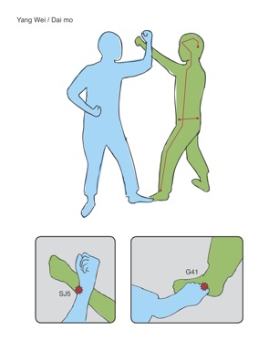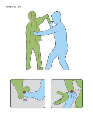 Illustration 4; Blue counters an attack by Green by grabbing the wrist at Small Intestine 3 and twists Green opening the ability to kick Bladder 62 thus activating the Yang Qiao and Du channels. The turned position of Green allows for targeting of points along the Yang Qiao and Spine/Du channel.