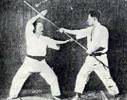 A rare photo of Gichin Funakoshi, who many consider the father of Japanese karate, demonstrating an open hand two bone forearm block against a downward staff (bo) strike. |
