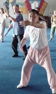 Dr. Zaiwen Shen leading Christopher Caile and others in a class in his family's form of Tai Chi held in Guelph, Canada in the summer of 1993. Dr. Shen's grandfather studied with Yang family decedents in China. He is Caile's Qigong master and teacher. Caile was a private disciple of Dr. Shen for many years when Dr. Shen taught in Toronto, Canada, before he moved to Japan. There Dr. Shen was a Professor of Health Sciences at Chukyo Women's University where he conducted extensive research into qigong. Currently he is President of Dr. Shen's College of Health Medicine in Nagoya, Japan. |