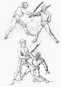 “When two unskillful men (being valiant) shall fight with long single rapiers, there is less danger in that kind of fight, by reason of their distance in convenient length, weight, and unwieldiness, than is with short rapiers, whereby it comes to pass, that what hurt shall happen to be done, if any with the edge or point of their rapiers is done in a moment, and presently will grapple and wrestle together, wherein most commonly the strongest or best wrestler overcomes, and the like fight falls out between them, at the long rapier and poniard, but much more deadly, because instead of close and wresting, they fall most commonly to stabbing with their poniards.”