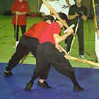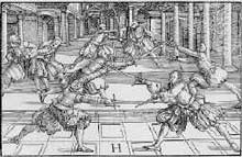 There is evidence close-in techniques were excluded from the German Fechtschulen events of the 1500s where, in order to perform safe displays, rules were in place to prevent such techniques. Similarly, the 1573 Sloane manuscript of the London Masters of Defence states that in Prize Playing events “who soever dothe play agaynst ye prizor, and doth strike his blowe and close withall so that the prizor cannot strike his blowe after agayne, shall Wynn no game for anny Veneye”. The implication in such cases is that while closing and seizing is effective and understood, it is inappropriate for the public display intended to show a student’s skill at defending and delivering blows. In 1579, Heinrich Von Gunterrodt noted that “Fencing is a worthy, manly, and most noble Gymnastic art, established by principles of nature…which serves both gladiator and soldier, indeed everyone, in …battles, and single-combats, with every hand-to-hand weapon, and also wrestling, for strongly defending, and achieving victory over.” Von Gunterrodt, also observed: in fencing, “when one will not cede to the other, but they press one against the other and rush close, there is almost no use for arms, especially long ones, but grappling begins, where each seeks to throw down the other or cast him on the ground, and to harm and overcome him with many other means.”