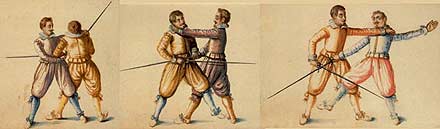 “When two valiant men of skill at single rapier do fight, one or both of them most commonly standing upon their strength or skill in wrestling, will presently seek to run into the close…But happening both of one mind, they rather do bring themselves together. That being done, no skill with rapiers avail, they presently grapple fast their hilts, their wrists, arms, bodies or necks, as in …wrestling, or striving together, they may best find for their advantages. Whereby it most commonly false out, that he that is the best wrestler, or strongest man (if neither of them can wrestle) overcomes, wrestling by strength, or fine skill in wrestling, the rapier from his adversary, or casting him from him, wither to the ground, or to such distance, that he may by reason thereof, use the edge or point of his rapier, to strike or thrust him, leaving him dead or alive at his mercy.”