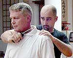 (2) Interestingly this technique can be found in the karate kata, Pinan one. Part of the kata includes three steps forward, each step (into a front leaning stance) accompanied by upper blocks. Now visualize how an upper block is done. One arm is raised above the head (exactly the position of the right arm in the above self-defense technique) while the other, which had been held vertically in the center, is pulled down (some styles of karate do their upper blocks differently, in which case this example would not perfectly apply). This downward motion is the same as the grab and pull down on the knife hand used in the above situation. Both the kata and the self-defense technique also follow by a turn inward. In the kata this is seen a only a pivot, but in the self-defense technique it is a turn under the knife arm (the attack could also be a one arm, around the throat grab). Now in the kata the next move is a double are knife hand technique or block. In some styles a Shotokan karate this technique is sharper and more angled, while in other styles as Seido Karate and Kyokushin the block is more circular. In either case, however, the left forearm moves downward and the right forearm moves back toward the body. This is the same motion as when you have the opponent’s arm bent backward – you apply pressure out and downward with your forarm along his back. With the right arm you reach downward and around his head (pulling his head or in a choke) backwards toward your middle – just as the right hand in the kata.