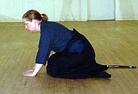 To start the bow, bend forward(back straight)and slide the left hand from the thigh to the floor, fingers together, thumb out. Next slide the right hand to the floor. The thumbs and forefingers of both hands touch slightly, creating what Tamiya ryu teacher Michael Alexanian calls an “arrowhead shape” on the floor. The back and arms remain straight. |