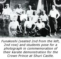 Funakoshi photos were reproduced from his 1935 book, Karatedo Kyohan. The group portrait of Funakoshi dan ranking students was provided courtesy of Masters Publications.