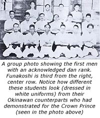 Gima's cousin Tokuda Anbun, already a highly talented Karate-ka in Okinawa, was awarded Nidan with five other first Dan diploma's being awarded to Otsuka, Kasuya, Akiba, Shimizu and Hirose. These fine instructors proved to be instrumental in spreading Funakoshi's Karate.