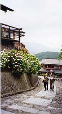 The Nakasendo (literally, Center Mountain Road) was, and is, an Edo period (1603-1867) highway, one of five built to connect areas of Japan. Originally, the Nakasendo linked Kyo (Kyoto), in the east to Edo (Tokyo) in the west, and as the name implies, ran through the center of Honshu (the largest island of Japan, called the Mainland). Like its better known cousin, the Tokaido, which ran along the Pacific coast, the Nakasendo provided a valuable link for commerce as well as official government business. Some 30 daimyo (powerful feudal lords who ruled over domains, or hans, and had retainers –Samurai. In modern times hans were replace by a prefecture system) and their attendants, as well as lesser samurai, merchants, commoners, royalty and imperial officials, traveled the Nakasendo throughout the Edo Period. It provided a principle political link between the city symbolic of both the emperor, and cultural (Kyoto) and the Tokugawa military capital (Edo) from where the Tokugawa Shoguns (a hereditary title and rank given to the head of the military government) controlled the country.