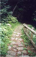I soon made it through the town and crossed the highway, up into the trees. The going was certainly steep, but not rough. From time to time, the paving stones gave way to stamped earth, covered with leaves and pine needles; other times the steep grade was replaced by stairs (probably a recently-added feature). All around, trees stopped what sunlight there was. However, it was not quiet. I could hear the sounds of cars speeding by occasionally, even though I could not see them, along with rushing water, birds singing, and insects, incessantly, buzzing. The minshukan obasan was right; the way was unbrokenly steep for most of the first half of my 7.7-kilometer journey.