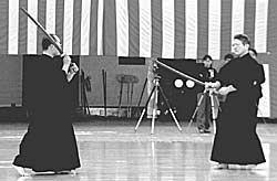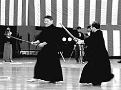 Shidachi in hasso no kamae. Is clasing on a stationary uchidachi. Who is standing in seigan no kamae. |