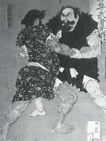 “It is recorded during the reign of the emperor Suinin in the year 23 B.C. Taema no Kuehaya (who was described as a noble of great strength and stature) fought Nomi no Sukune of Izumo province. During the course of this ferocious battle Nomi delivered a monstrous kick to the ribs of Taema (breaking them) and knocking him down. Nomi then finished him with a bone crushing stomp on Taema’s hip. An injury Taema would die from a day later.” (1)