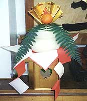 The dojo’s spiritual center with holiday decorations. At top the miniature shrine is flanked with pine boughs set in vases. Below, on the left, is a display of holiday rice-cakes (Kagami Mochi). At middle is a replica of a samurai armored helmet and at right a ceremonial sake keg, another holiday symbol.