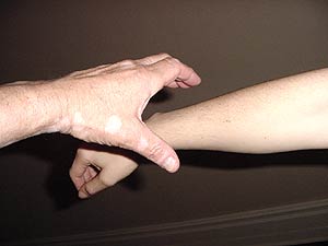 When grabbing an arm, for example, notice how the curled fingers of top hand grip and dig into painful (lung and heart meridian) points just above the elbow. The lower hand grips and digs into sensitive (lung and small intestine meridian) points on the underside of the wrist. Together these grips produce intense pain and create a tingling sensation along the arm all the way to tips of several fingers.