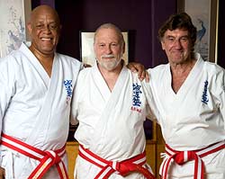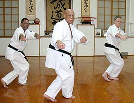 Hanshi Martin often assists senior Seido students with kata and technique before or after class. Here he is assisting Sei Shihan Christopher Caile and Sei Shihan William Best with an advanced kata.