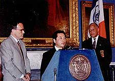 Hanshi Charles Martin with Kaicho Tadashi Nakamura during a meeting with New York City Mayor Rudi Guiliani in 1999. For many years Seido Karate has donated funds from benefit karate tournaments through the NYC mayor's office to various charitable causes, such as children and abused women's programs. |