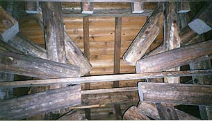 I reached the castle proper by means of a vermillion bridge that stretches from the park to the base of the Northern Tower, which is also the entrance to the castle complex. The Northern Tower, or Inui Kotenshu, is four stories high, but typically, looks like three stories from the outside (see photo below). The Northern Tower is constructed inside by a series of rough-hewn beams, which come together in the roof of the topmost floor.