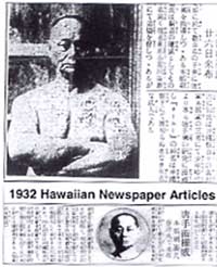 Two announcements of Motobu's arrival in Hawaii appeared in local Hawaiian newspapers at that time. The March 13th 1932 issue of a local Japanese newspaper named, "The Nippon Jiji," reads, "Karate-jutsu authority, Motobu Choki will be arriving in Hawaii on board the Shunyo Maru. Motobu Choki who is teaching karate-jutsu to several hundred students in Tokyo is a well-known authority and presently has his own dojo in Hara Town of Koishikawa Ward of Tokyo. At this time, we understand that he is en route to Hawaii on board the Shunyo Maru, scheduled to arrive on the 26th. Invited by Tamanaha Yoshimatsu of Hawaii, Motobu Choki is the third son of the wealthy Motobu family from the town of Suri in Okinawa Prefecture. He's enthusiastically studied karate-jutsu since his childhood and is recognized as an authority on Japan."