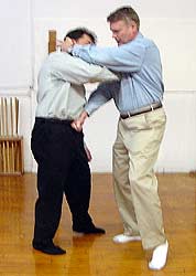 If an opponent attacks, he is becomes momentarily unbalanced. Deal with the attack but also move past or if the space is tight, slip and slide — that is, get one foot and leg between him and the wall and slide past him using your forward arm against his shoulder to propel you past (also discussed in the last section).