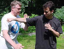 Another effective and widely taught standing choke taught in aikido, jujutsu, karate, kung fu and in many other arts is a defense against a straight punch is shown here. The defender deflects a straight punch to the inside (or dodges it to the outside) with one hand while bringing the other arm under the punch (across the attacker's body), as if reaching for the attacker's ear (opposite the striking arm), the wrist ending on the opponent's shoulder. The deflecting arm goes behind the attackers head, the two hands gripping and pulling the attacker in (the actual grip and elbow position differ depending on the art). The punching arm and shoulder and the side of the neck are then pressed together to create the choke which often ends in a take down.