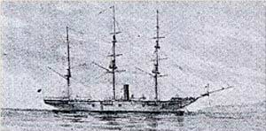 Not long after departing, the Kanrin Maru ran into one of the worst typhoons ever encountered in the Pacific. An American Officer, U.S. Navy Lieutenant John M. Brooke, and nine other American sailors under his command, helped save the ship. The Kanrin plodded ahead, and after 37 days at sea, she finally dropped anchor in San Francisco harbor. The Japanese mission, sailing aboard the US naval warship Powhatan, did not arrive until twelve days later. On arriving in San Francisco Bay the Japanese Admiral in charge of the ship made a handsome present in money to each American. On board were also US Army officer Capt. Burke, a civilian E.M. Keen. For a more detailed story on the passage of the Kanrin Maru click here.