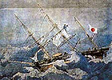 A Japanese woodblock print depicting the stormy voyage of the Kanrin Maru in 1860