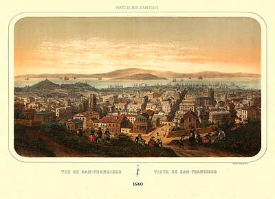 How San Francisco looked in 1860. It was an amazing sight to the Japanese visitors. San Francisco at the time was a thriving commercial town with exploding growth following the California Gold Rush of 1849 and the 1850's. By ship and by wagon train a flood of treasure seekers from the US and immigrants from Latin America, Europe, Australia and Asia had swollen San Francisco.