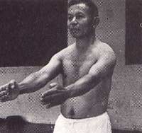 Master Kanbun Uechi (1877-1948), the founder of Uechi-Ryu Karate, performing a double spear hand thrust that appears toward the end of Sanchin. |