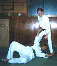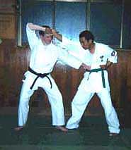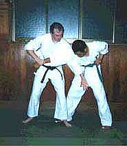 Photograph 1. The application of the posture. The right hand pulls the opponent's right hand to break his balance as the left hand strikes into the lower body. Possible kyusho targets are denko (GB-24) or inazuma (Liv-13). The idea here is to inflict damage on the opponent before throwing.