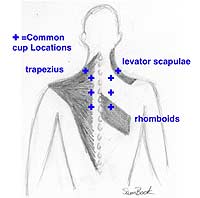 Making a habit of relaxing and dropping the shoulders can eventually correct this problem. Regular massage and adjusting your steering wheel and computer can also help. Often these measures are insufficient to fully release the muscles. One very valuable traditional treatment for this condition is fire cupping. There are a number of Fire Cupping methods. Two of the most common are illustrated below.
