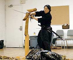 | Sang Woo Kim of New York Battodo cutting makiwara (photo courtesy Sang Woo Kim). |
