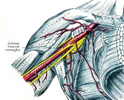 I learned that the armpit is a major junction of thickly packed arteries, veins and nerves leading to the arms which are largely unprotected by muscle mass or bone. The following illustration shows some of these elements, but is limited since arteries, veins and nerves overlap. In yellow is the brachial plexus (a complex web of nerves that start in the lower neck, go down under the collar bone) as it branches into the axillary, radial, median and ulner nerves which innervate the arm.(4) In red is the axillary artery, the thick root of much of the arm's artery network. The brachial vein which runs through this area and is fed by a major part of the arm's return blood system is not shown. Neither are the lymph glands that are also found in this area. Thus, a concentrated sharp upward strike to this region could cause damage, shock, impede function, cause swelling or rupture one or more of these systems. (5)